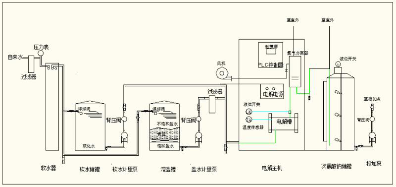由軟化水系統、濃鹽水配制系統、稀鹽水配置系統、電解系統、儲存系統、排氫系統、投加系統、控制系統、安全監測系統等組成。