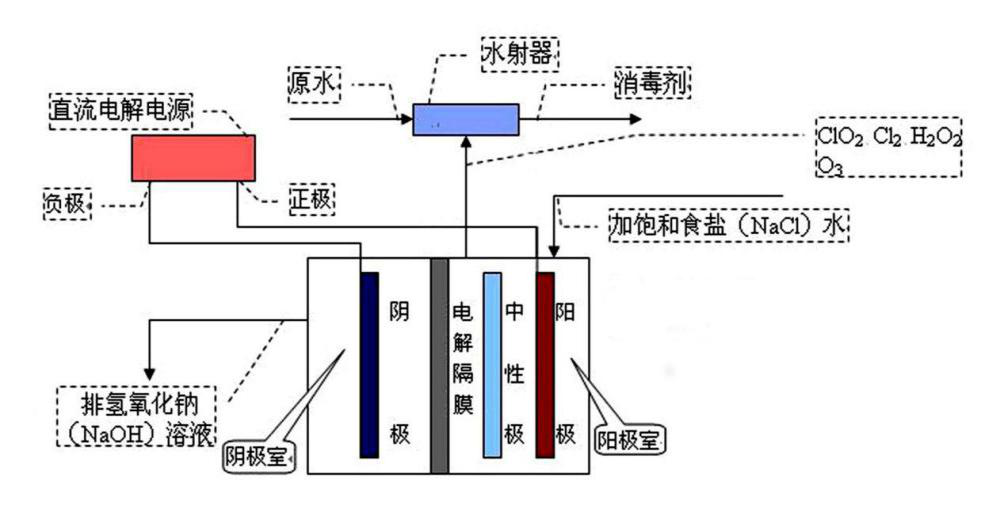 飽和食鹽(NaCl)水,在特殊電解隔膜的電解槽中電解,產生含有ClO2、Cl2、O3等強氧化性消毒氣體,通過水射器負壓抽提,投加至待消毒水中。